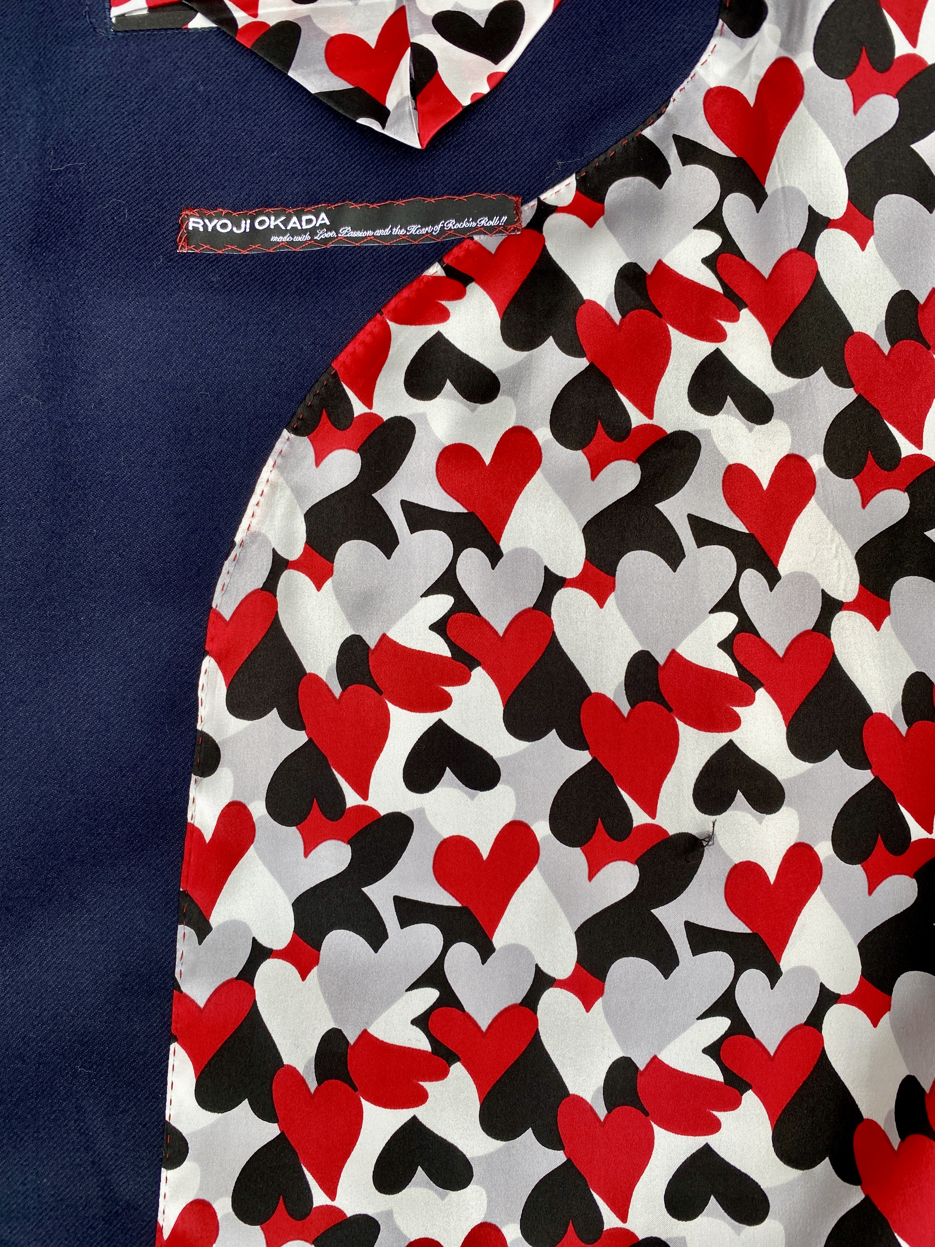「カラー裏にレッド糸でお入れした文字刺繍」「ネイヴィブルーに染め上げたmade in Englandのリアルホーン(本水牛)ボタン」「 “♡ Camo” c/# RWGBライニング」といったオーダーメイドならではのエキサイティングなデイティルも見逃せません。
