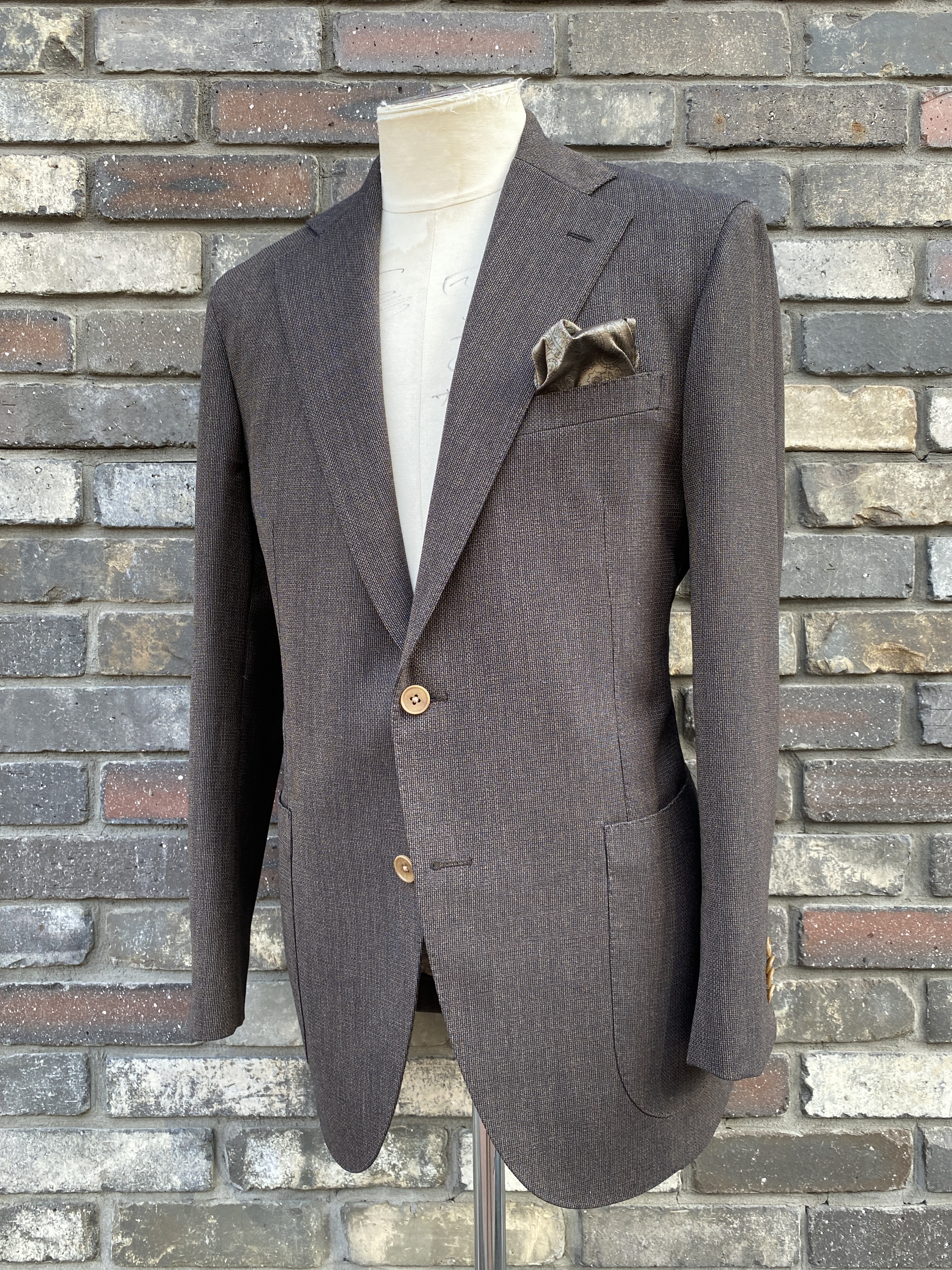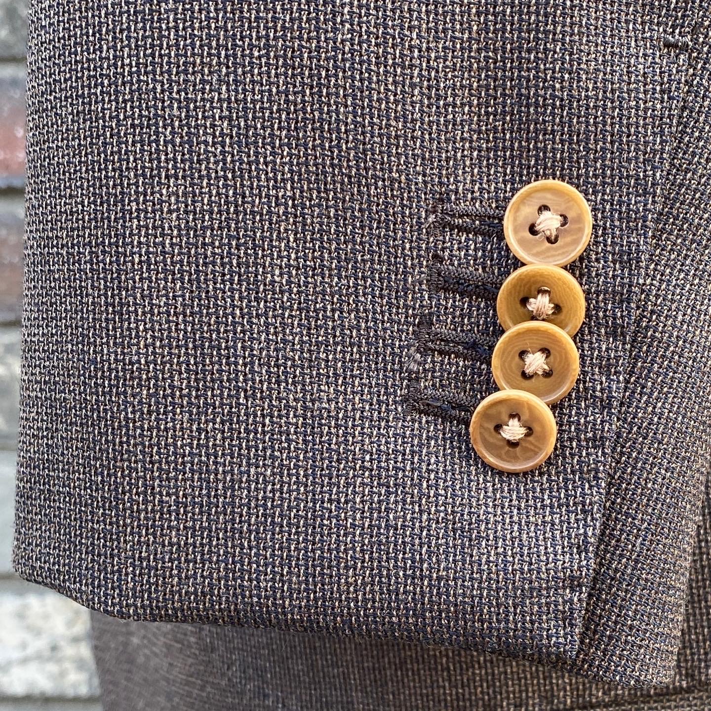 具体的には「やや太め:9.5cm巾のノッチドラペル」「クラシカルな高さ/位置のシングルブレステッド2ボタン」「パッチ/アウトスタイルの腰ポケット」「シャツ袖」「深め:26.5cmのサイドベンツ」といったデザインでお作りしました。