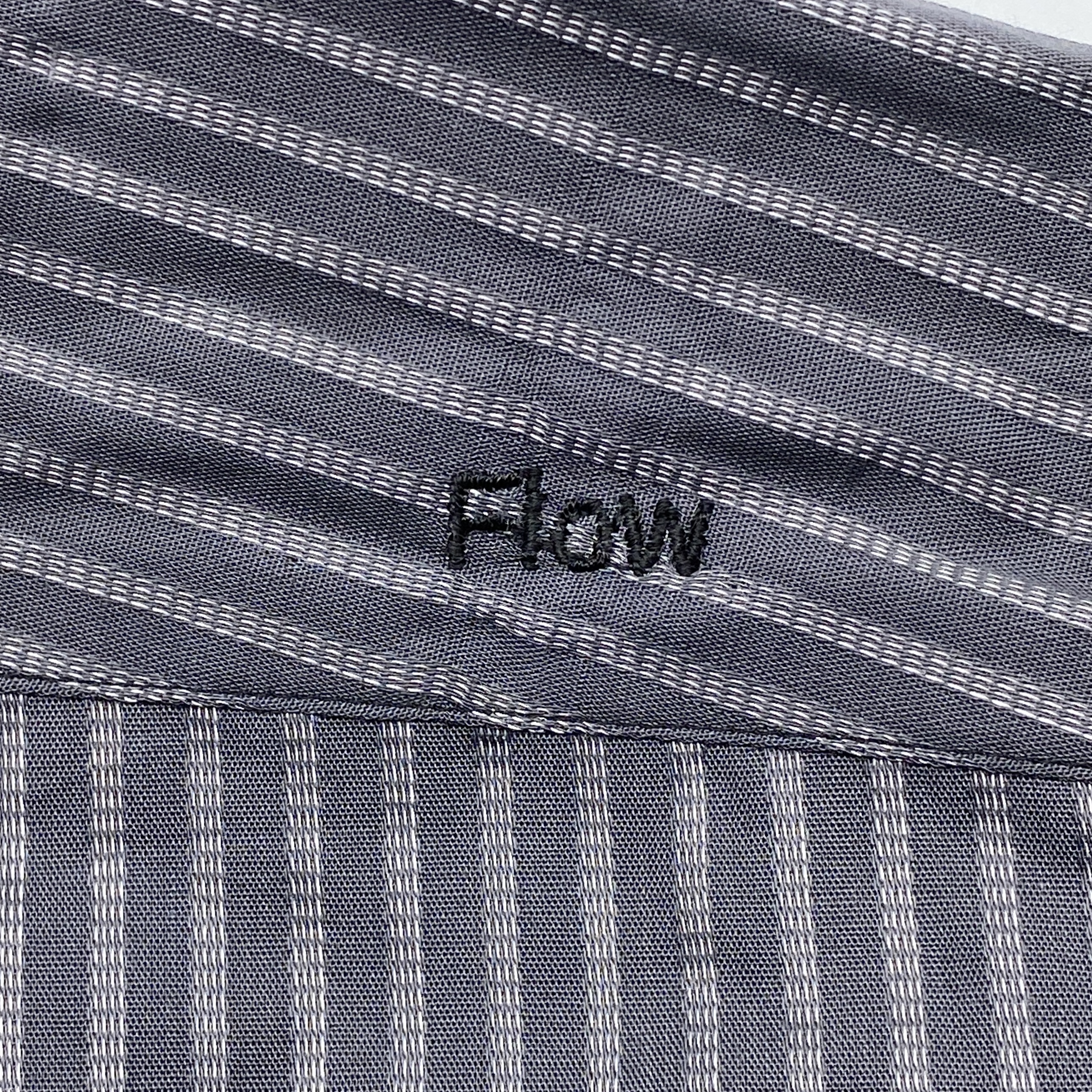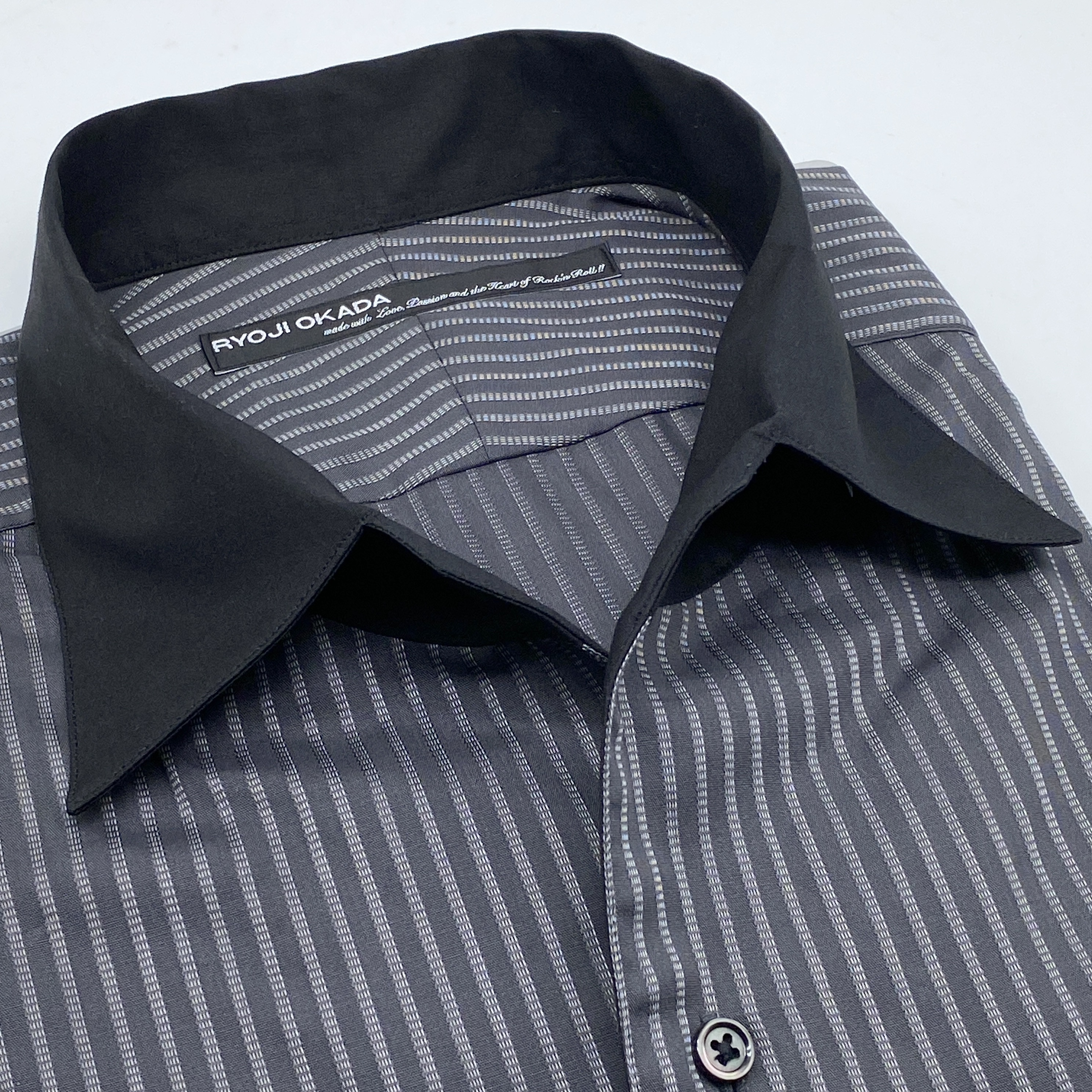 ブラック無地のポプリン/ブロード(平織)素材を使用したカラー、深く上品な光沢が見事なブラックマザーオブパール(黒蝶貝)ボタン、ショルダーヨーク右後ろにブラック糸でお入れしたFlow刺繍といったオーダーメイドならではのエキサイティングディテイルも見逃せません!