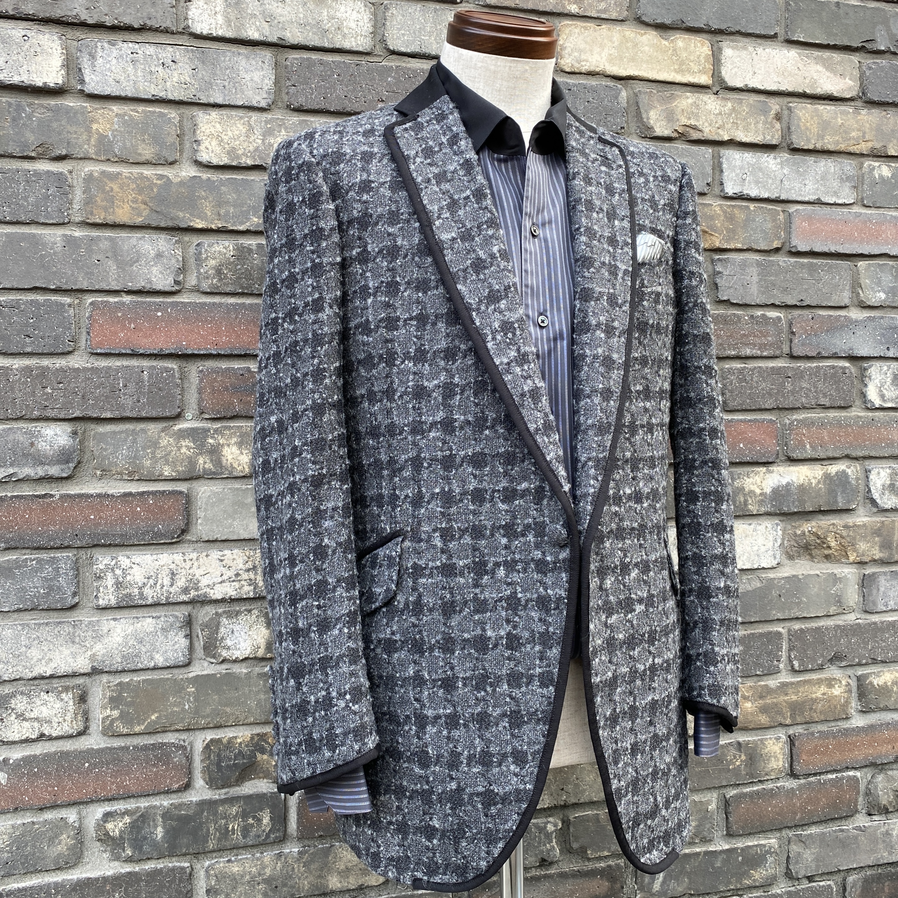 具体的には「ノッチドラペル + シングルブレステッド1ボタン + ハッキング/スランテッドポケット + サイドヴェンツ」 でお作りしました。
