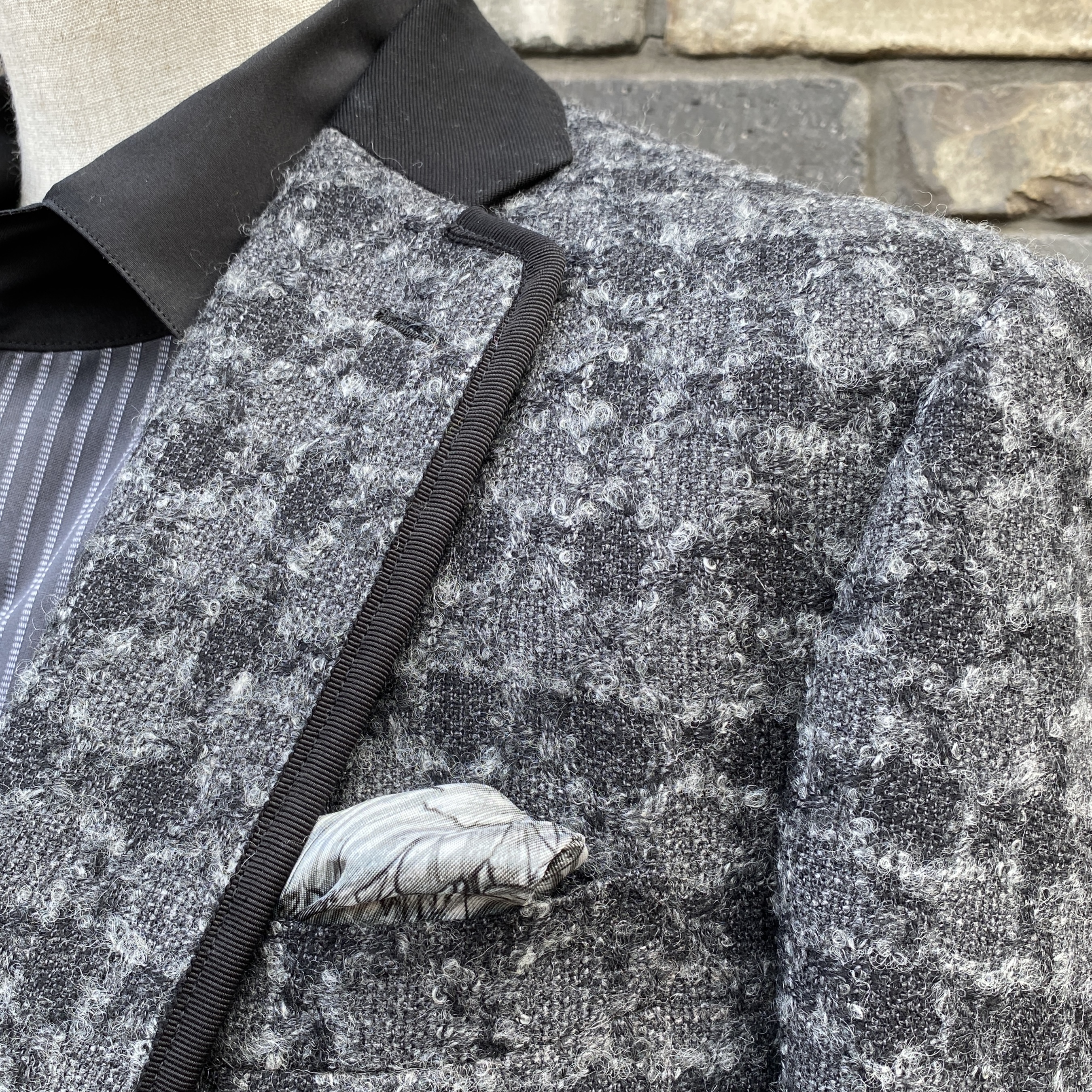 上衿やパイピングで使用したブラックグログラン、くるみボタン、名門UKマーチャントHFW社謹製のグレイグラデーションフローラルプリントライニング、5個&スランテッドリアルボタンホール(本開き切羽)といったオーダーメイドならではのエキサイティングディテイルも見逃せません。