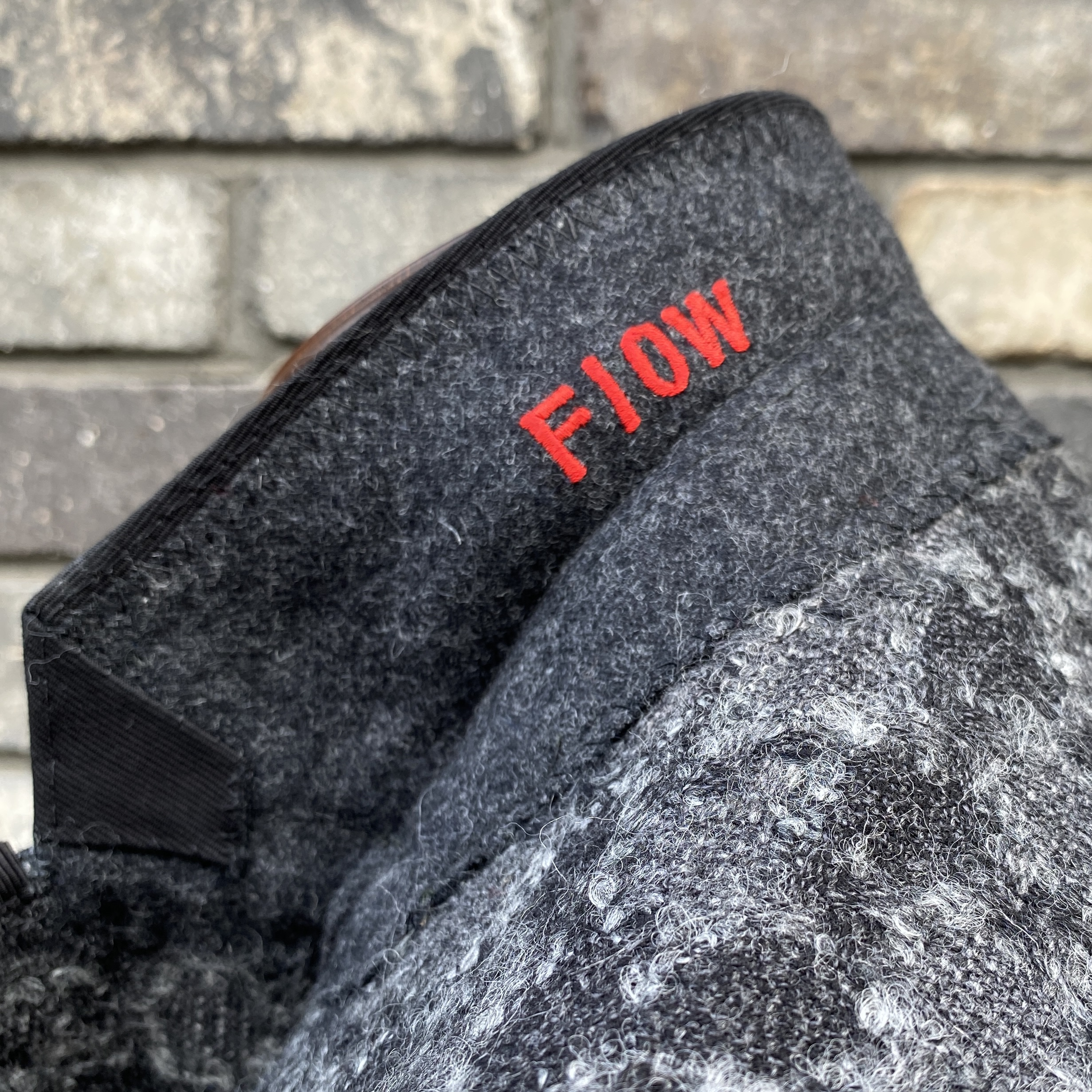 カラークロス(上衿裏のフェルト生地)にレッド糸でお入れしたFlow(F様のニックネーム)刺繍はF様のトレードマークです!