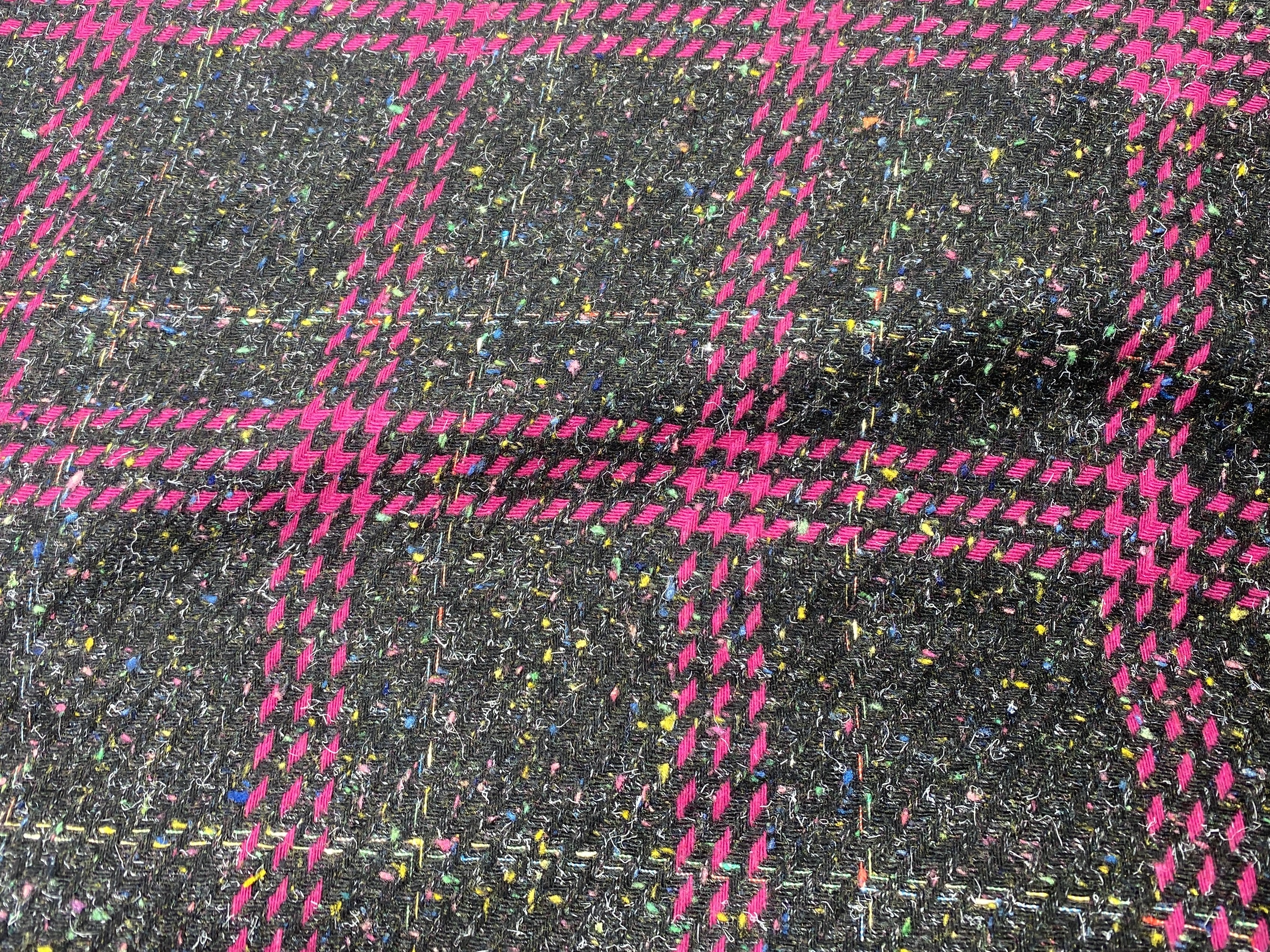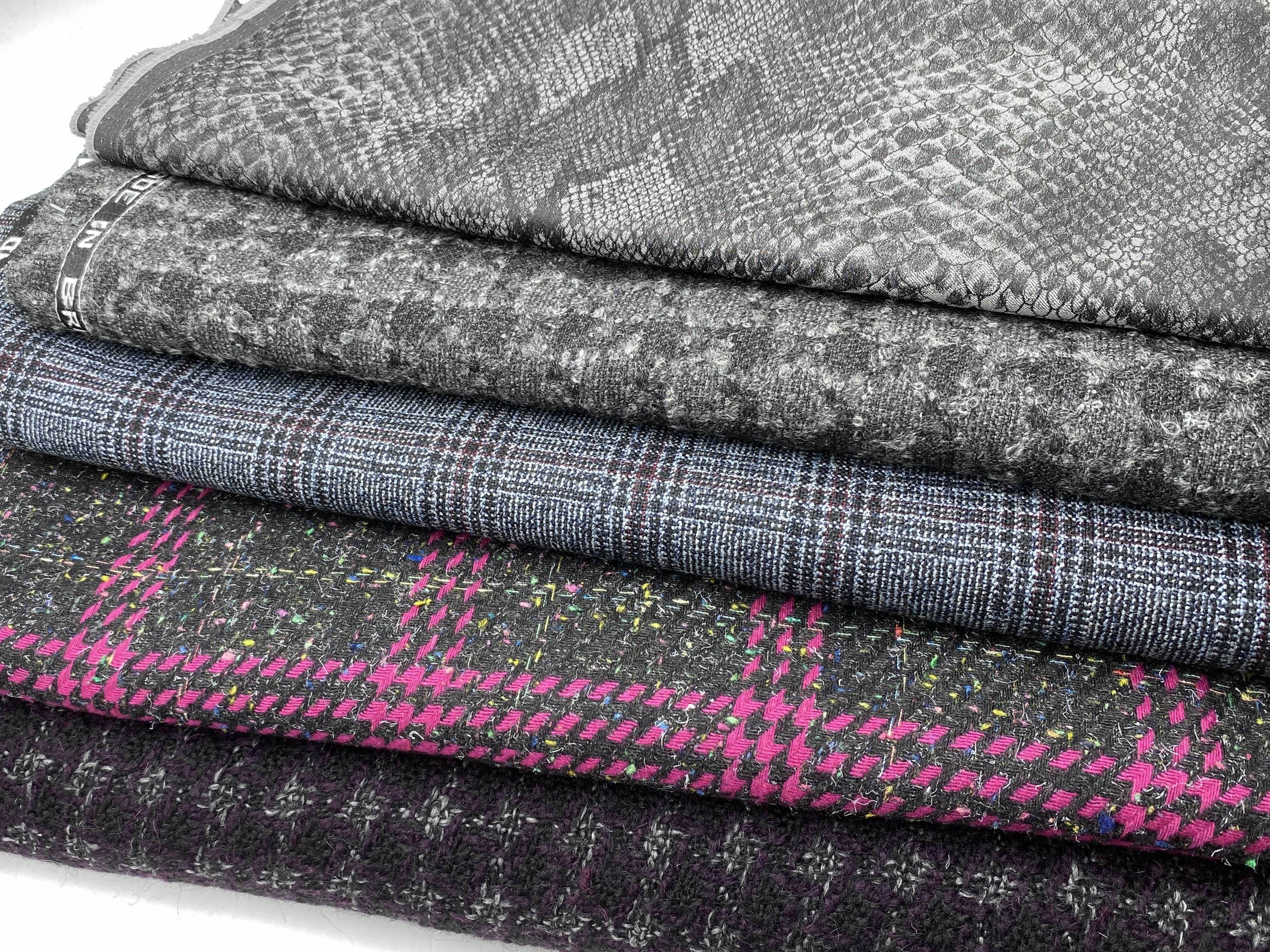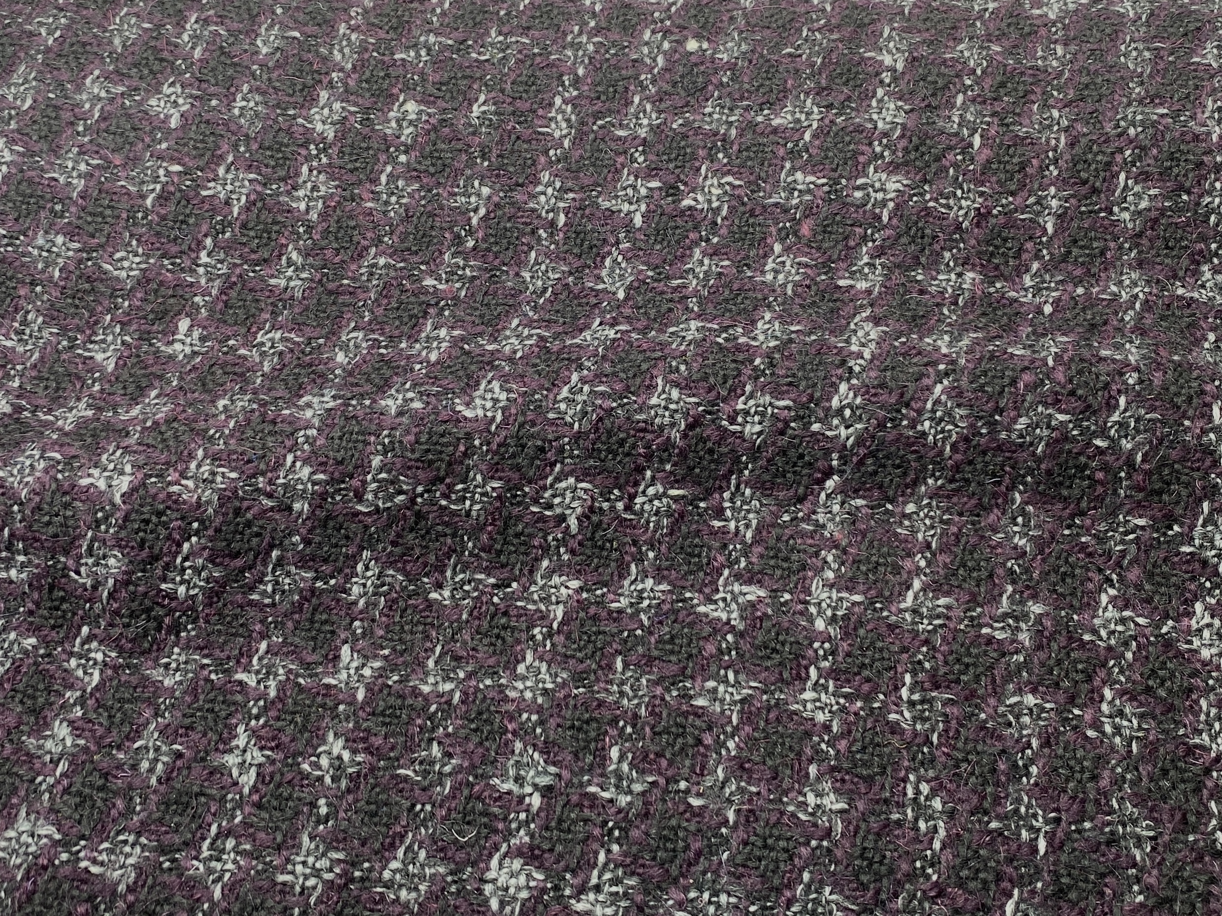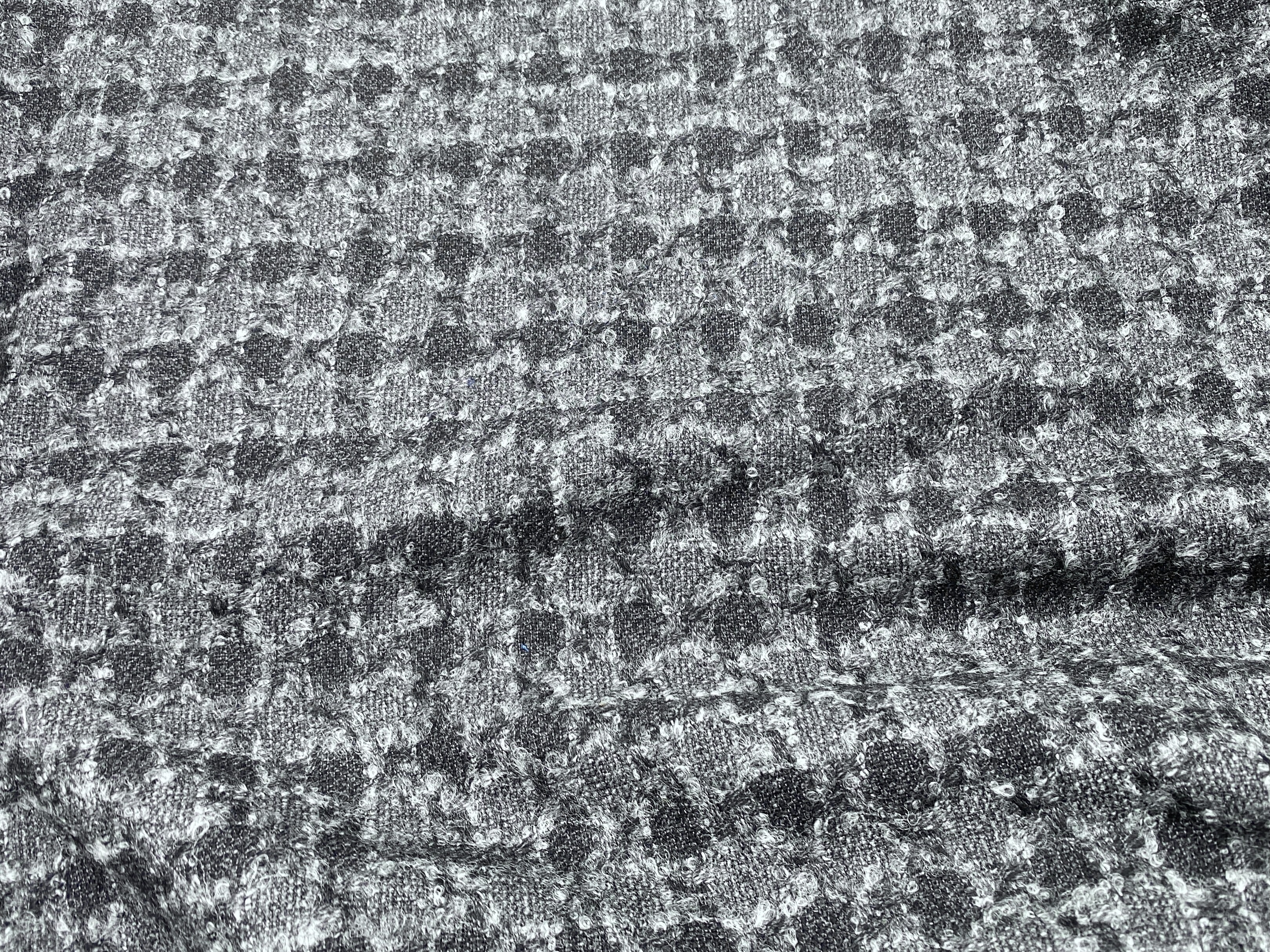 「1788年に創業されたTweedなどカントリーテイストが強いスポーティな素材を得意とするScotlandが誇るスーパー老舗ミル:Kynoch」の「クール&ニートなGreyグラデーション」と「大きめサイズのハウンズトゥース風チェック」と「ブークレ糸を巧みに使って表現した独特の立体感を生み出すループヤーン」が三位一体となったモダンクラシックでクリエイティヴなTweedです。