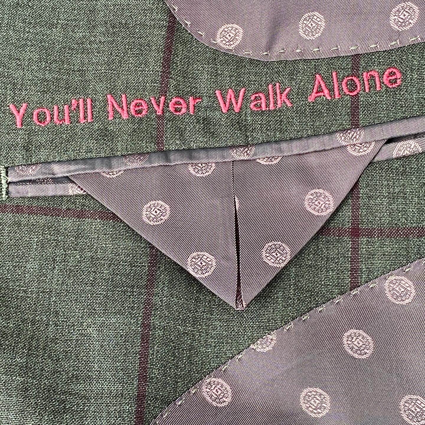 「ヴァイオレットのカラークロス(上衿裏のフェルト生地)」「グレイッシュピンクの小紋柄風ジャカードライニング」「表面:ブラック・裏面:パープルのバイカラーナットボタン」「袖口の5個ボタン・リアルボタンホール(本開き切羽)・スランテッドボタンホール・色違いボタンホール」「パープル糸で下前(シタマエ:右手側の前身頃)に入れたYou’ll Never Walk Alone刺繍」といったオーダーメイドならではの遊び心あふれるディテイルも見逃せません。