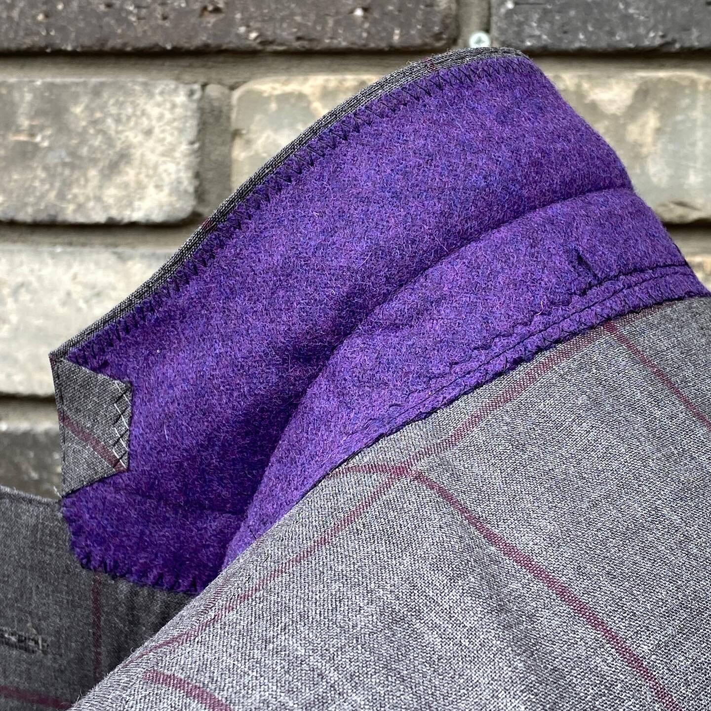 通常は表素材のベースカラー(このスーツの場合グレイ)になるのですが、敢えてヴァイオレットにしました。